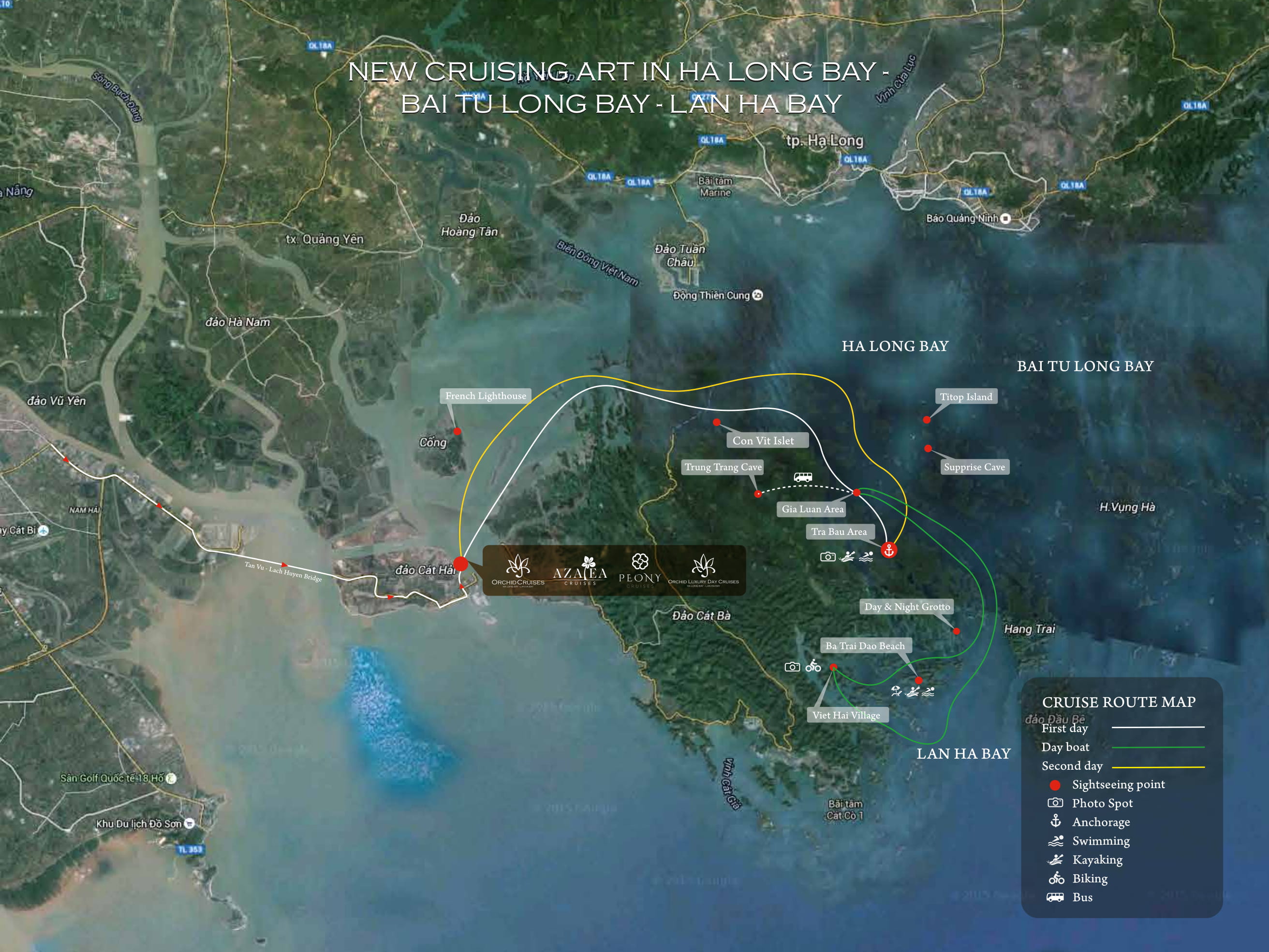Azalea Cruise halong bay is one of the newest cruises in Halong Bay, this cruise visits three bays: Halong Bay, Bai Tu Long Bay, Lan Ha Bay and Cat Ba island.