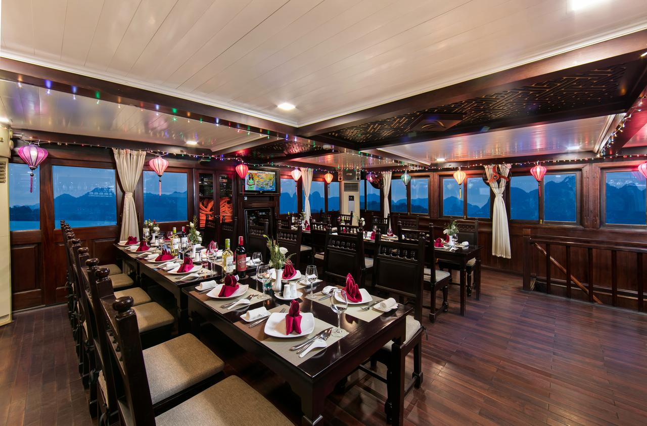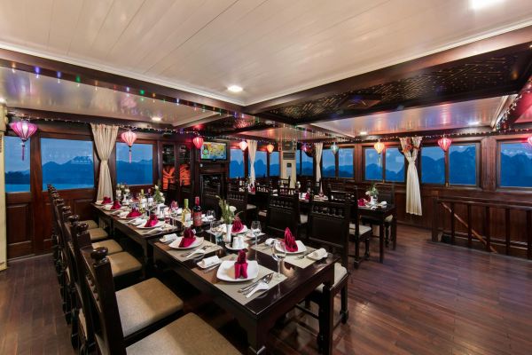 First deck have 07 deluxe cabins, second deck have 5 deluxe cabins and the top deck serves as a perfect place to enjoy lingering in the sunshine and discovering the splendid beauty of Halong bay. The restaurant on second deck to server over 27 persons with delicious traditional dishes of Vietnam.