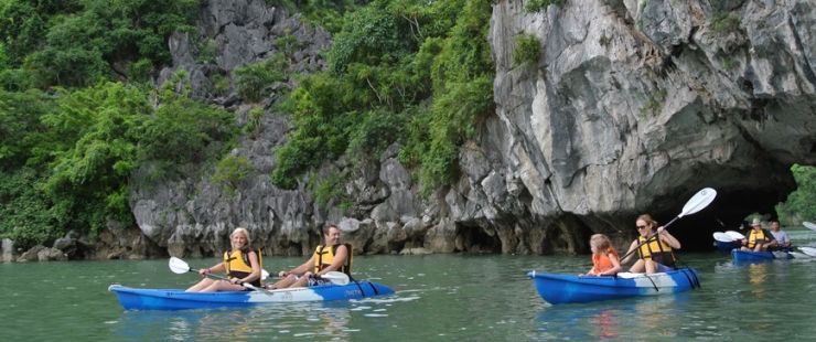 13.00 | Orchid Day Cruise reaches Hang Sang – Hang Toi area (Brightness sea cave – Darkness sea cave) where belongs to Cat Ba National Park. Hopefully you are good luck enough to see White Head Langurs who are strictly preserved by Vietnamese Park Ranger and also highly protected in Vietnamese Red Book. It’s time to enjoy a 45 minutes –Kayaking or Vietnamese bamboo boat with its rower for a lovely trip at the hidden area. |