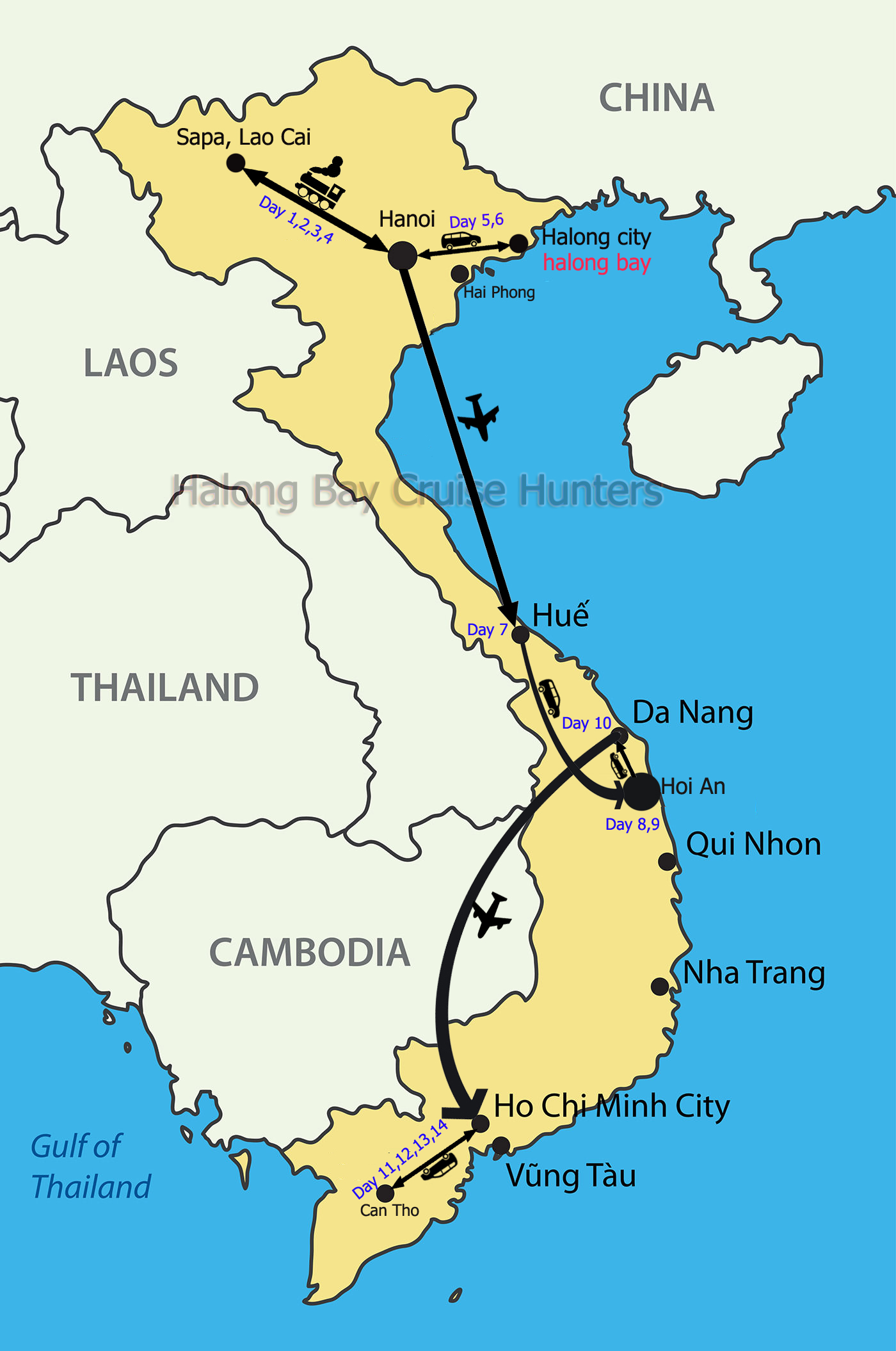 Route: Hanoi , Sapa , Halong Bay , Hue , Hoi An , Da Nang , Ho Chi Minh city